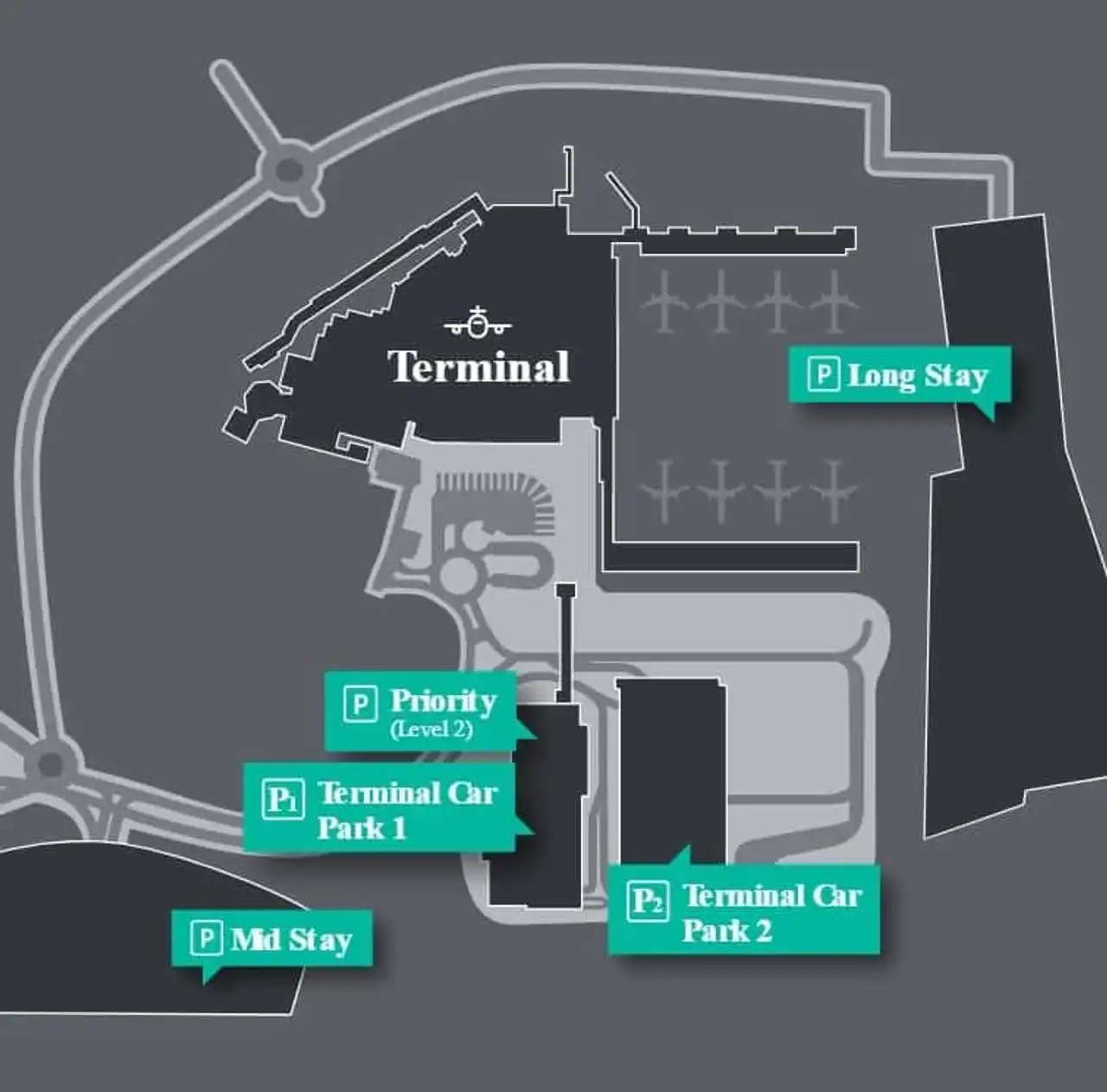 The four official car parks at London Luton Airport are: Terminal Car Park 1, Terminal Car Park 2, Mid Stay Car Park and Long Stay Car Park.